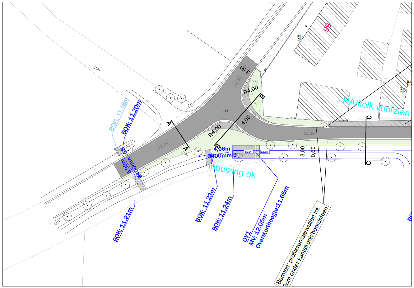 De bestaande baangrachten worden behouden en geherprofileerd om enerzijds het regenwater vlotter af te voeren bij hevige regenval, maar eveneens om het water bij te houden en lokaal te infiltreren als er een droge periode aanbreekt. Op deze manier trachten we ons te wapenen tegen extreme weersomstandigheden.